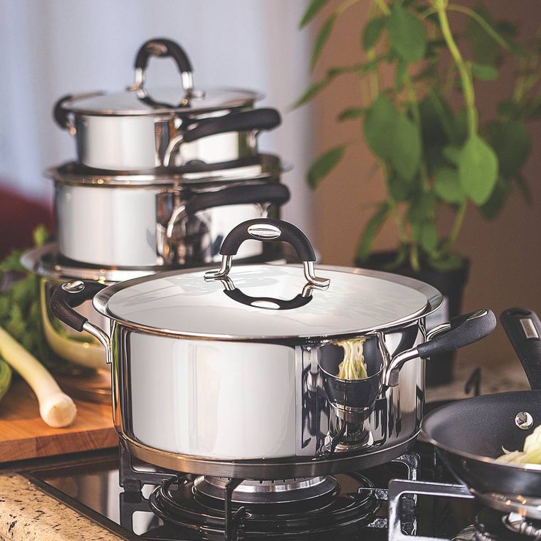 - Economiza tempo e energia: o segredo está no fundo triplo (aço inox + alumínio + aço inox), que distribui o calor uniformemente, proporcionando um cozimento mais rápido. Por isso, você pode manter o fogo baixo durante todo o preparo e, assim, poupar energia.