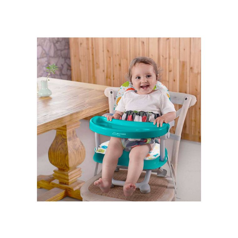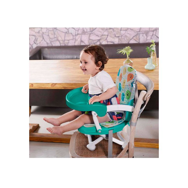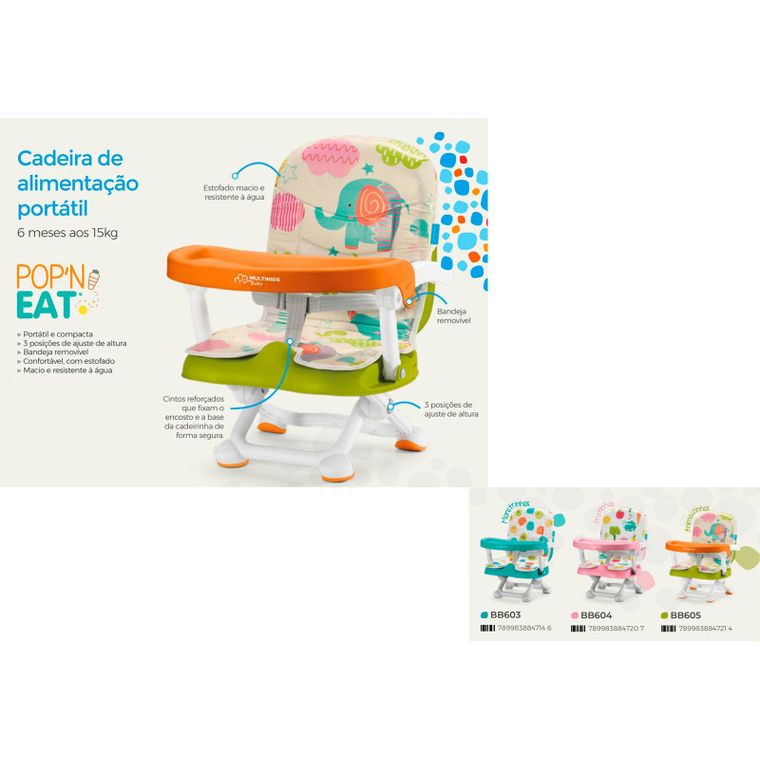 A Cadeira de alimentação é portátil e compacta, possui estofado macio e resistente a água, bandeja removível e cintos reforçados que fixam o encosto e a base da cadeirinha de forma segura, possui 3 posições de ajuste de altura.