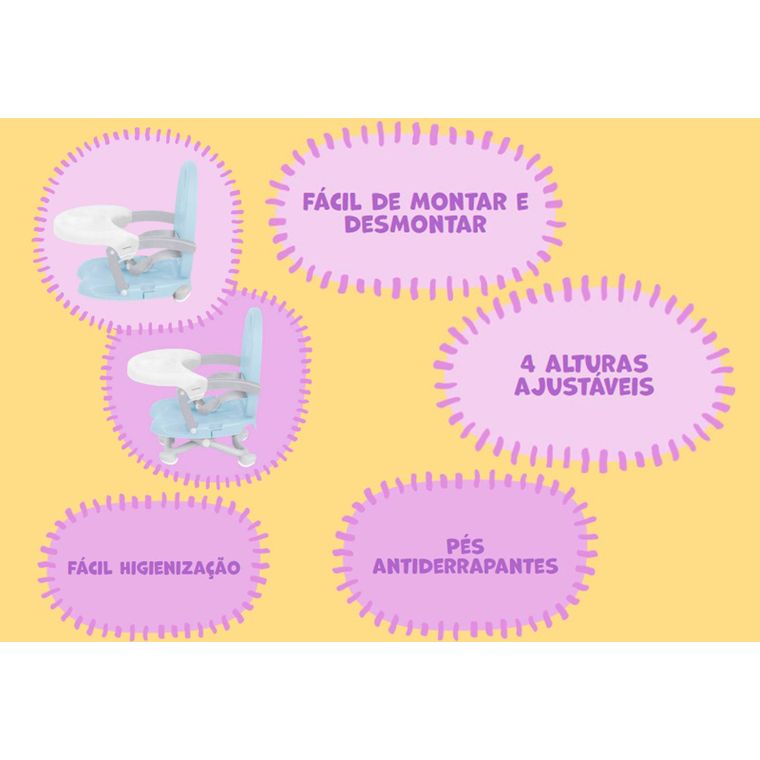 O momento da introdução alimentar marca uma nova fase do desenvolvimento do seu pequeno. São inúmeras mudanças e adaptações, começando pelas refeições em família - agora os pequenos vão se sentar à mesa também. O assento Peanuts pode ser usado desde os 6 meses ou assim que o bebê já conseguir sentar sozinho e suporta até 15 kgs. Portátil e compacto, é bem simples e fácil de montar e desmontar e conta com uma alça que permite que ele seja carregado como uma maleta quando fechado. Com pés antiderrapantes, cinto de segurança de três pontos e tiras que fixam o encosto e a base na cadeira de adulto de forma segura, o assento Peanuts é 100% seguro oferecendo tranquilidade para os pais curtirem a refeição com o bebê. Um dos diferenciais do assento Peanuts é sua versatilidade - suas quatro opções de altura e bandeja removível, fazem com que seja muito fácil acomodar em qualquer mesa de adulto, bastando regulá-lo de acordo. E se precisar usar com a bandeja, ele vem com um porta copos para ajudar na organização. Feito em material durável e resistente, o assento Peanuts é super fácil de higienizar. Com apenas um paninho úmido é possível limpar o assento e a bandeja, deixando seu bebê livre e à vontade para explorar esse novo mundo cheio de gostosuras!