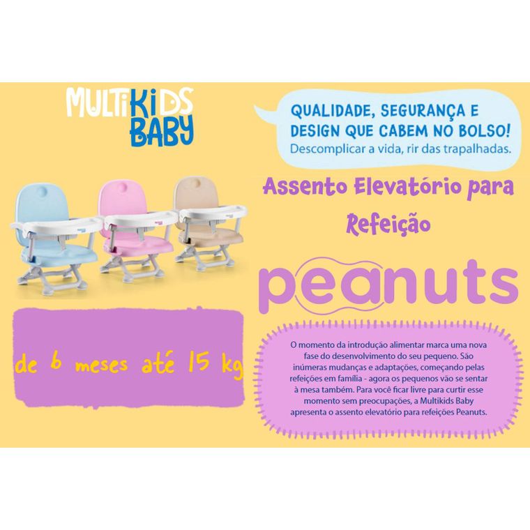 O momento da introdução alimentar marca uma nova fase do desenvolvimento do seu pequeno. São inúmeras mudanças e adaptações, começando pelas refeições em família - agora os pequenos vão se sentar à mesa também. O assento Peanuts pode ser usado desde os 6 meses ou assim que o bebê já conseguir sentar sozinho e suporta até 15 kgs. Portátil e compacto, é bem simples e fácil de montar e desmontar e conta com uma alça que permite que ele seja carregado como uma maleta quando fechado. Com pés antiderrapantes, cinto de segurança de três pontos e tiras que fixam o encosto e a base na cadeira de adulto de forma segura, o assento Peanuts é 100% seguro oferecendo tranquilidade para os pais curtirem a refeição com o bebê. Um dos diferenciais do assento Peanuts é sua versatilidade - suas quatro opções de altura e bandeja removível, fazem com que seja muito fácil acomodar em qualquer mesa de adulto, bastando regulá-lo de acordo. E se precisar usar com a bandeja, ele vem com um porta copos para ajudar na organização. Feito em material durável e resistente, o assento Peanuts é super fácil de higienizar. Com apenas um paninho úmido é possível limpar o assento e a bandeja, deixando seu bebê livre e à vontade para explorar esse novo mundo cheio de gostosuras!