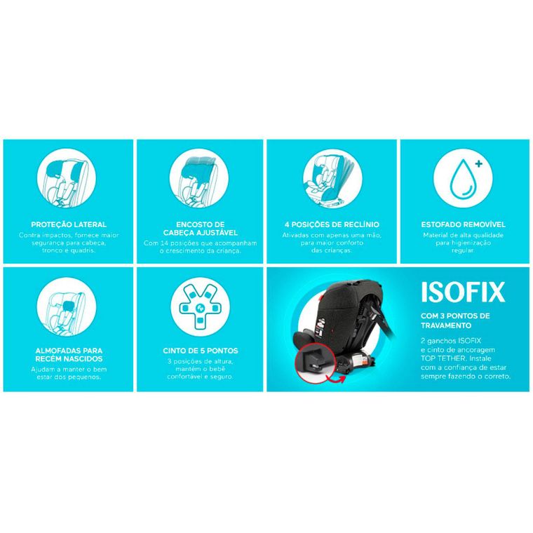 A All-Stages FIX está cheia de novidades! A Cadeira 2.0 conta com novo tecido, nova almofada e o dobro de espuma, tudo isso para permitir muito mais conforto, proteção e bem-estar para a criança durante o passeio. Adição de almofada interna para recém nascidos, muito mais macio e mais confortável, cobrindo toda a cadeira. O dobro de espuma em toda a cadeira. Encosto de cabeça com 14 posições, acompanhando o crescimento da criança. Ótima inclinação,chegando até 145° para o Grupo 0+.
