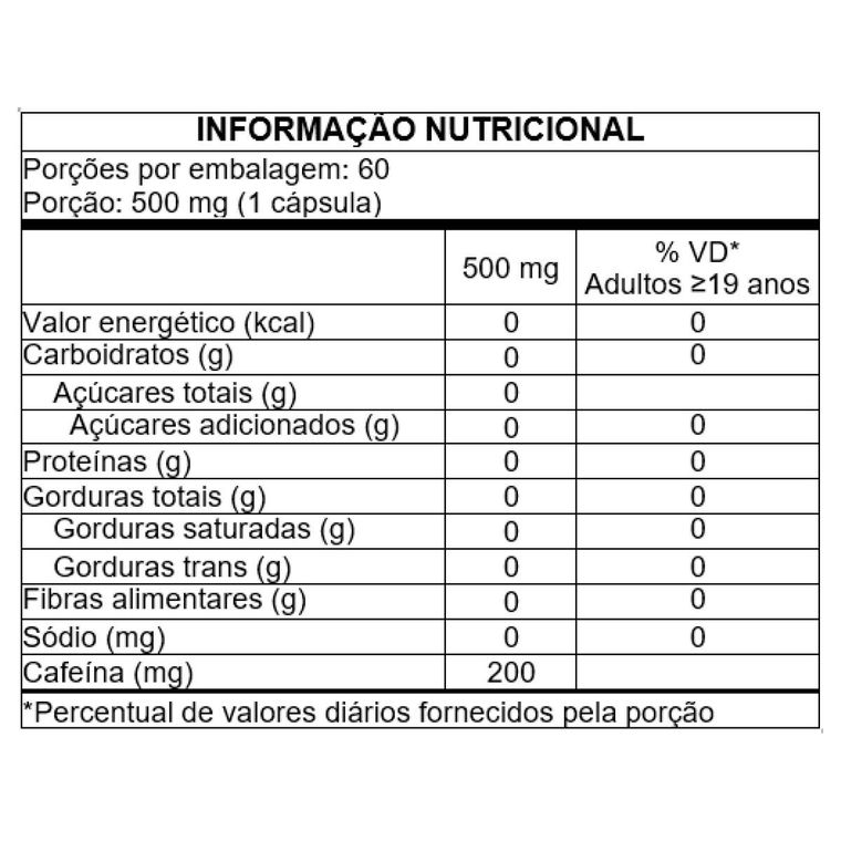 Cafeína, Maltodextrina, Agente de massa celulose microcristalina, Lubrificante estearato de magnésio e Antiumectante dióxido de silício.