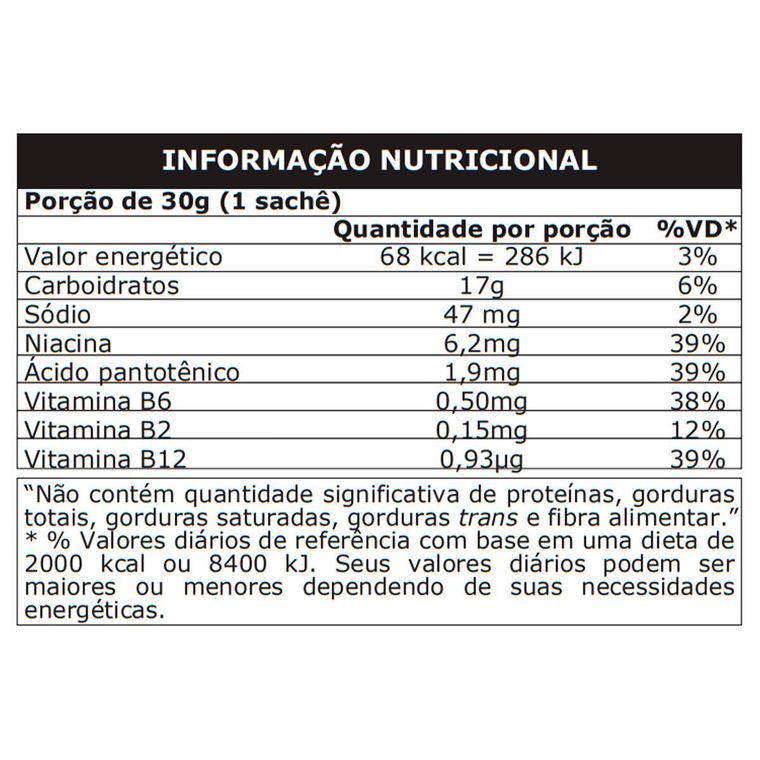 Maltodextrina, água purificada, taurina (93mg/30g), glucoronolactona (58mg/30g), cafeína (8,1mg/30g), nicotinamida (niacina), inositol (4,6mg/30g), pantotenato de cálcio (ácido pantotênico),cloridrato de piridoxina (vitamina B6), riboflavina (vitamina B2), cianocobalamina (vitamina B12), cloreto de sódio, amido de milho ceroso (waxy maize), regulador de acidez citrato monossódico, aromatizantes, conservadores sorbato de potássio e benzoato de sódio, acidulante ácido fosfórico e edulcorante sucralose.