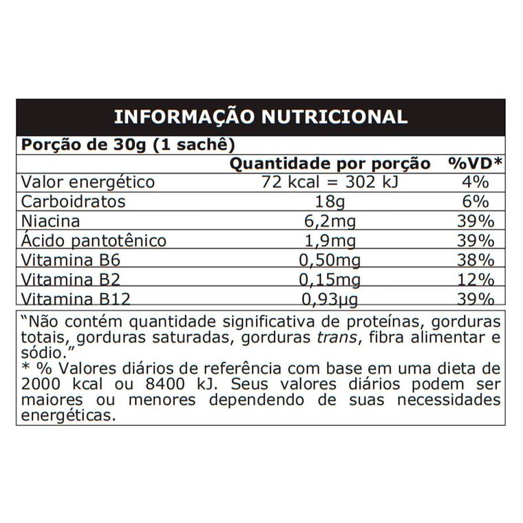 Maltodextrina, água purificada, taurina (93mg/30g), glucoronolactona (58mg/30g), cafeína (8,1mg/30g), nicotinamida (niacina), inositol (4,6mg/30g), pantotenato de cálcio (ácido pantotênico), cloridrato de piridoxina (vitamina B6), riboflavina (vitamina B2), cianocobalamina (vitamina B12), amido de milho ceroso (waxy maize), reguladores de acidez citrato monossódico e ácido fosfórico, acidulante ácido cítrico, aromatizante e conservadores sorbato de potássio e benzoato de sódio.