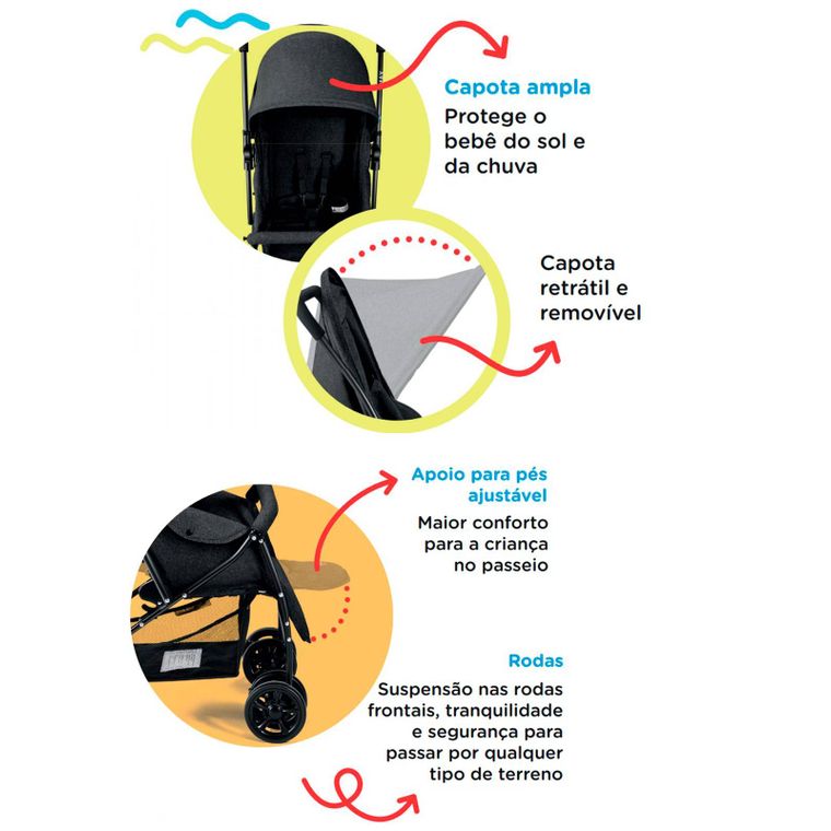· Apoio para pés ajustável - Maior conforto para a criança no passeio