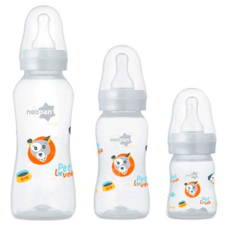 O conjunto de mamadeiras Neopan é composto por 3 mamadeiras nos tamanhos de 70ml, 140ml e 250ml.