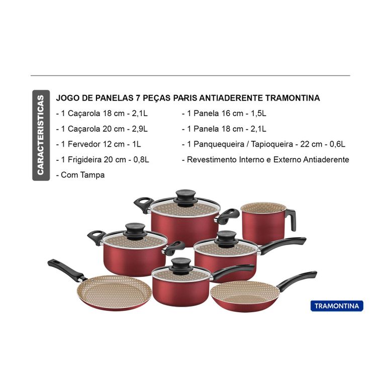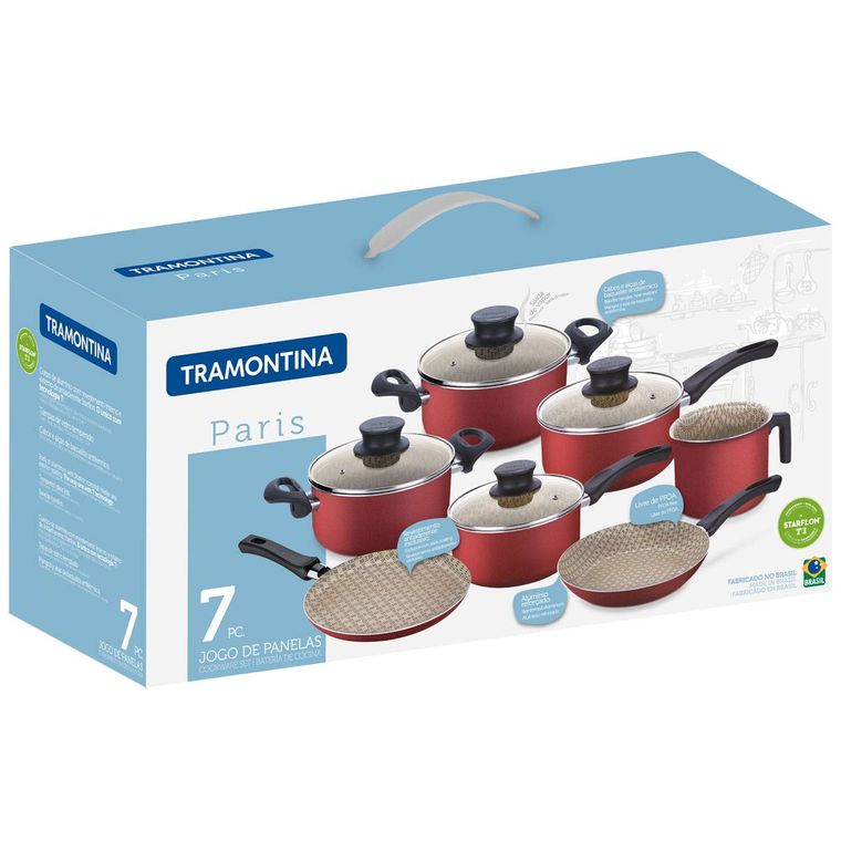 A Linha Paris é perfeita para quem gosta de preparar muitas delícias à família e receber os amigos e a decoração interna das peças representa a delicadeza e dedicação de quem cozinha! O jogo de panelas Tramontina Paris em alumínio com revestimento interno e externo em antiaderente Starflon Max vermelho 07 peças, foi desenvolvido para uso diário e é a escolha ideal para levar maior funcionalidade proporcionando o cozimento dos alimentos de maneira rápida e uniforme e alem disso são fáceis de lavar pois os alimentos não grudam. Suas panelas e caçarolas vem com tampas de vidro temperado com saída de vapor e borda de aço inox que auxiliam o preparo e facilitam a visualização das receitas. Os cabos, alças e pegadores são em material antitérmico e não esquentam, o que garante um manuseio muito mais seguro e confortável. Além de todas essas características, o jogo ainda é fácil de limpar e pode ir à máquina de lavar louças, deixando seu dia a dia na cozinha muito mais fácil!