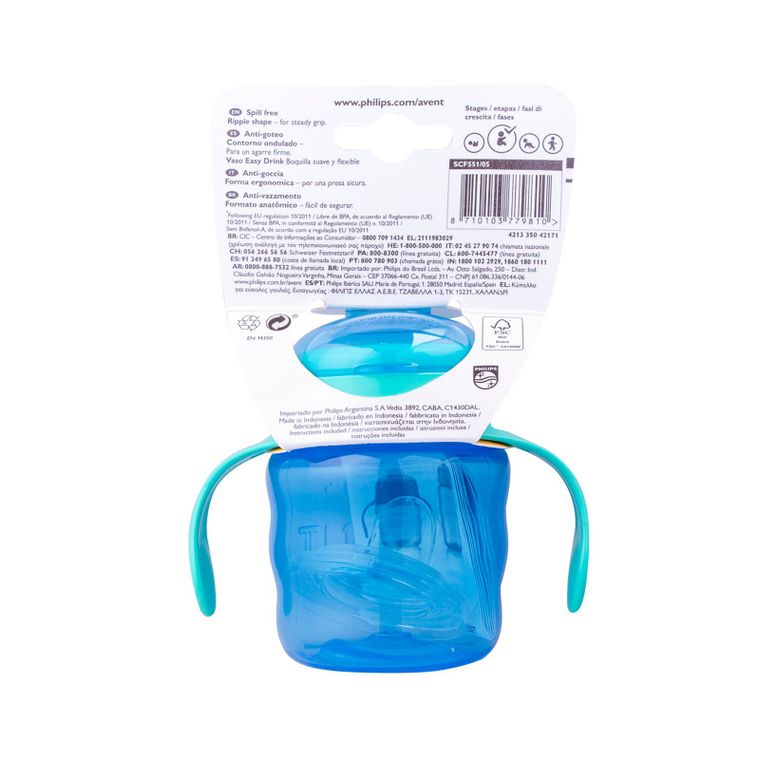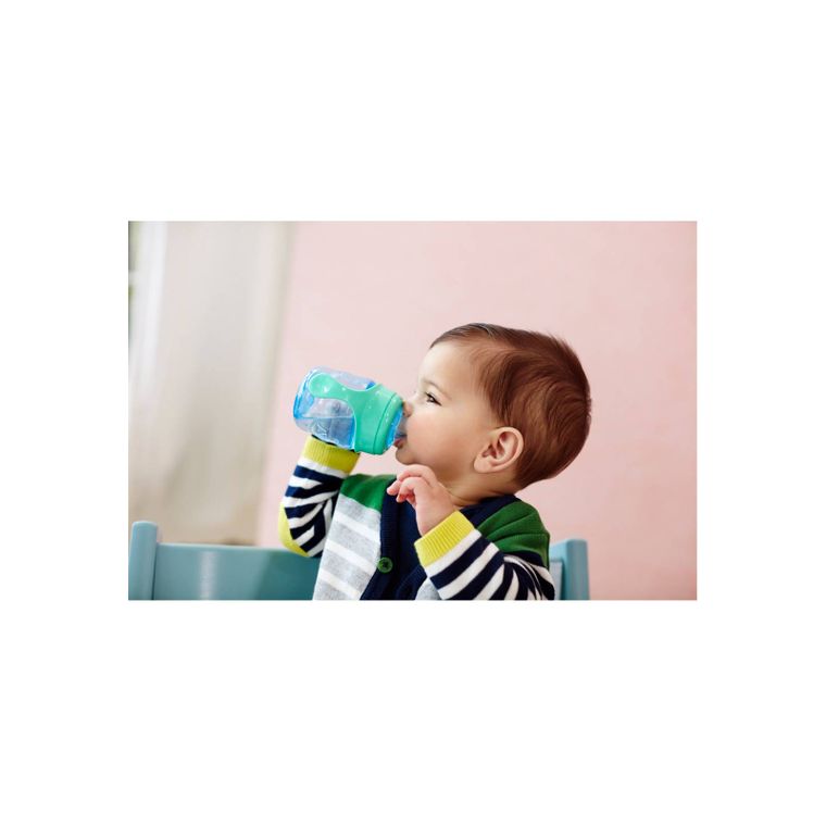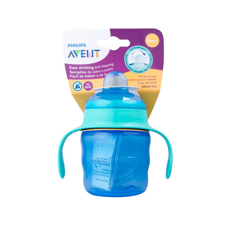 Copo Easy Sip Avent com alças, bico em silicone macio, ideal para gengivas irritadas com o nascimento dos dentinhos, formato ergônomico, fácil de ser segurado pelas mãozinhas pequenas, anti-vazamento que garante um ambiente sempre higiênico e limpinho e é prático de montar e desmontar. indicado para bebês a partir de 6 meses, 200ml.