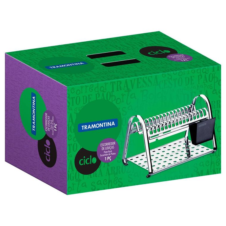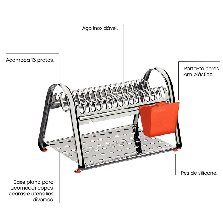 Com um design elegante e capacidade para 16 pratos, o Escorredor de Louça Tramontina em Aço Inox com Porta Talheres Laranja da linha Ciclo vai trazer cor e vida para a sua cozinha. Com essa peça, deixar a louça secar nunca teve tanto estilo. O Escorredor de Louça é produzido em aço inox, ou seja, ele é extremamente durável, mantendo suas características originais por mais tempo. Possui pés em silicone, evitando que escorregue e arranhe a superfície, porta-talheres em plástico, com opção de posição, e base plana para acomodar copos, xícaras e utensílios diversos.