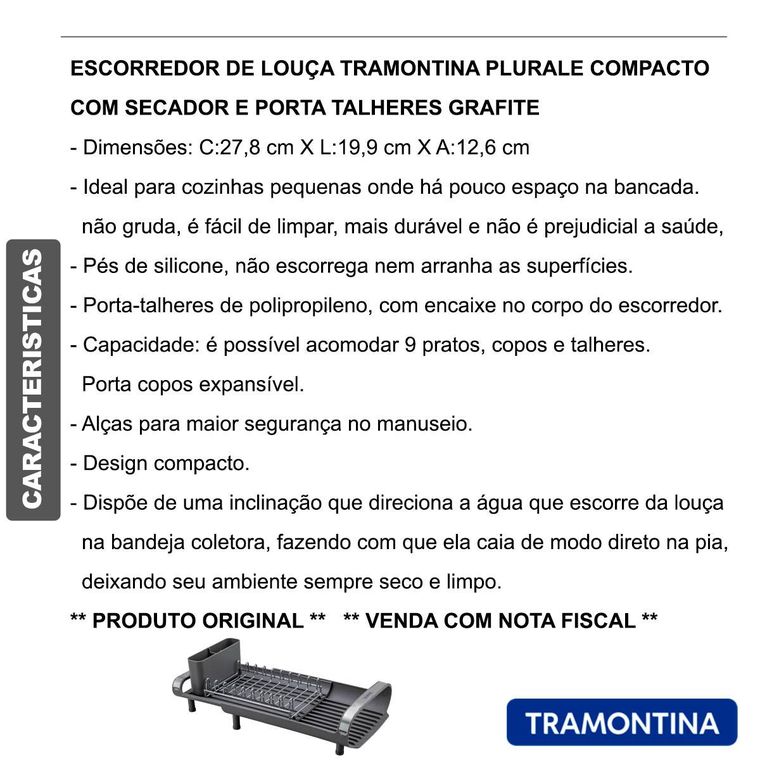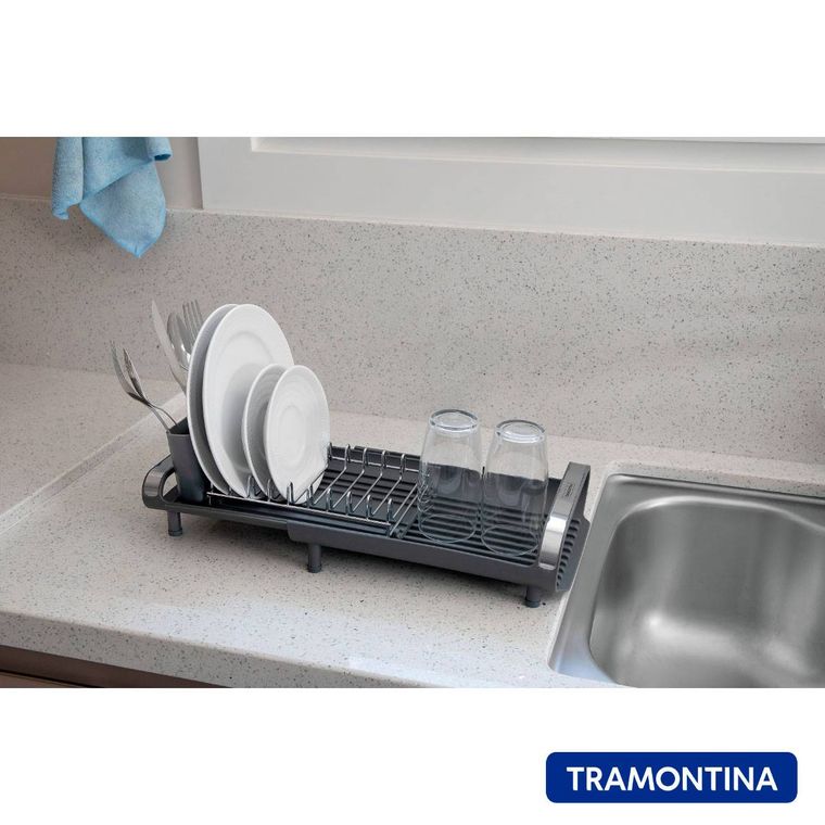 Para aqueles dias de rotina corrida que você não tem muito tempo para as tarefas de casa, conte com o escorredor de louça Tramontina com secador e porta talheres compacto grafite. Desenvolvido especialmente para cozinhas pequenas e que possuam bancadas com pouco espaço, ele conta com um prático porta talheres em polipropileno com perfeito encaixe em sua superfície. Compacto mais sem deixar de acomodar as louças que você precisa, ele comporta 9 pratos, talheres e copos, sendo o porta copos expansível. Possui alças que proporcionam maior segurança no manuseio e inclinação que direciona a água para a bandeja coletora, fazendo com que ela caia direto para a pia. Um item prático e indispensável para quem está sempre na correria!