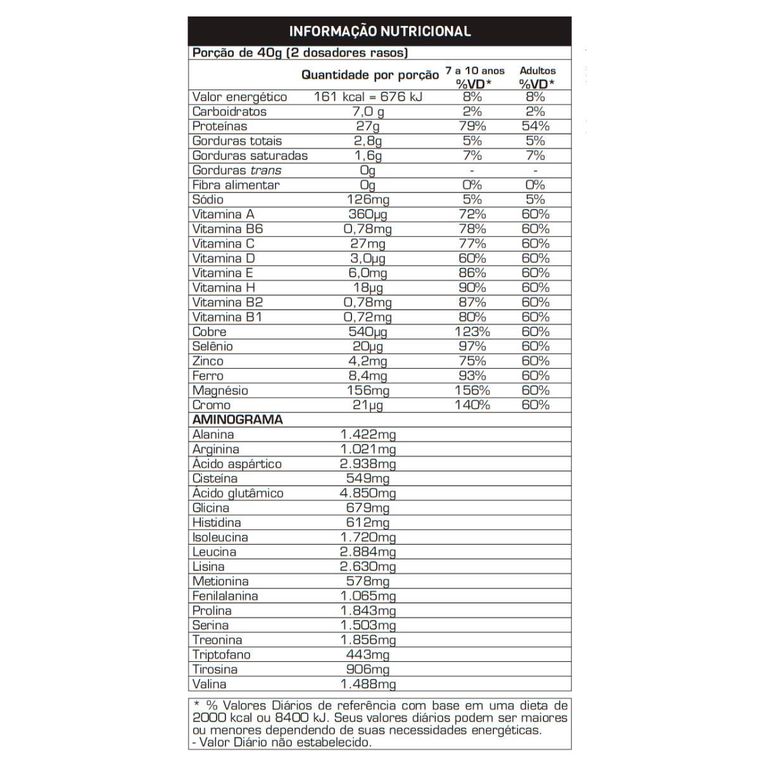 Proteína concentrada do soro do leite (WPC), proteína isolada da soja, colágeno hidrolisado, mix de vitaminas e minerais (óxido de magnésio (magnésio), ácido ascórbico (vitamina C), pirofosfato férrico (ferro), acetato de tocoferol (vitamina E), sulfato de zinco monohidratado (zinco), piridoxina (vitamina B6), riboflavina (vitamina B2), mononitrato de tiamina (vitamina B1), sulfato de cobre anidro (cobre), palmitato de retinol (vitamina A), cloreto de cromo hexahidratado (cromo), selenito de sódio (selênio), biotina (vitamina H) e colecalciferol (vitamina D)), emulsificante lecitina de soja**, aromatizantes e edulcorante sucralose. **utilizada na fabricação da proteína do soro do leite com a função de deixar o produto instantâneo (fácil diluição).