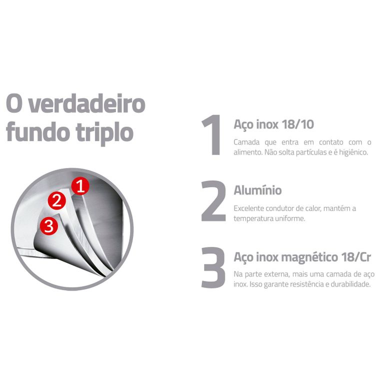 - O fundo triplo (aço inox + alumínio + aço inox) distribui o calor uniformemente, proporcionando um cozimento mais rápido e uniforme, economizando energia e deixando os alimentos aquecidos por mais tempo.