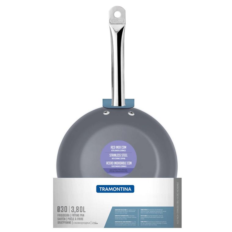 A Frigideira Tramontina Funda em Aço Inox Fundo Triplo Revestimento Interno Cerâmico Grafite possuí cabo, 30cm de diâmetro e capacidade de 3,8L, é ideal para quem adora cozinhar e pensa em sua saúde também.