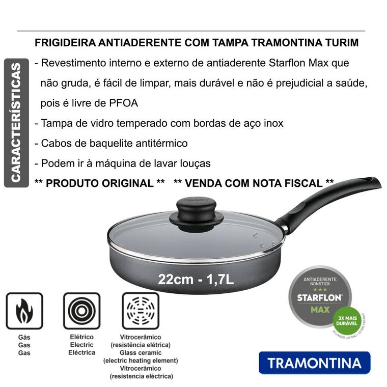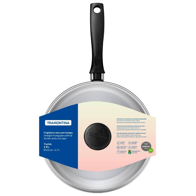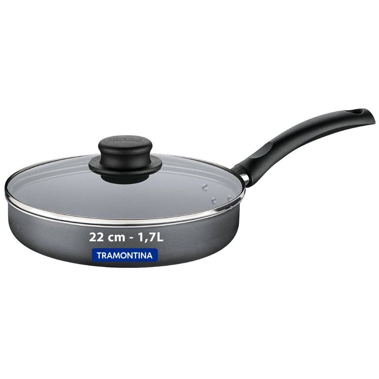 Garanta maior praticidade para a hora de preparar suas refeições com a Frigideira Reta Tramontina Turim em Alumínio com Revestimento Interno e Externo Antiaderente Starflon Max Cinza com Tampa de Vidro 22 cm de diâmetro 1,7 L! Com corpo produzido em alumínio com espessura especial que proporciona o cozimento rápido e uniforme dos alimentos e com revestimento interno e externo de antiaderente Starflon Max, ela evita que os alimentos grudem em sua superfície e não é prejudicial a saúde. Seu cabo é em baquelite antitérmico e reduz a propagação de calor, proporcionando assim, um manuseio muito mais seguro e confortável. Ela ainda vem acompanhada de tampa de vidro temperado que auxilia no preparo das suas receitas, é muito fácil de limpar e pode ser levada à máquina de lavar louças, facilitando sua rotina na cozinha. Com a Tramontina, você tem o melhor para sua cozinha!