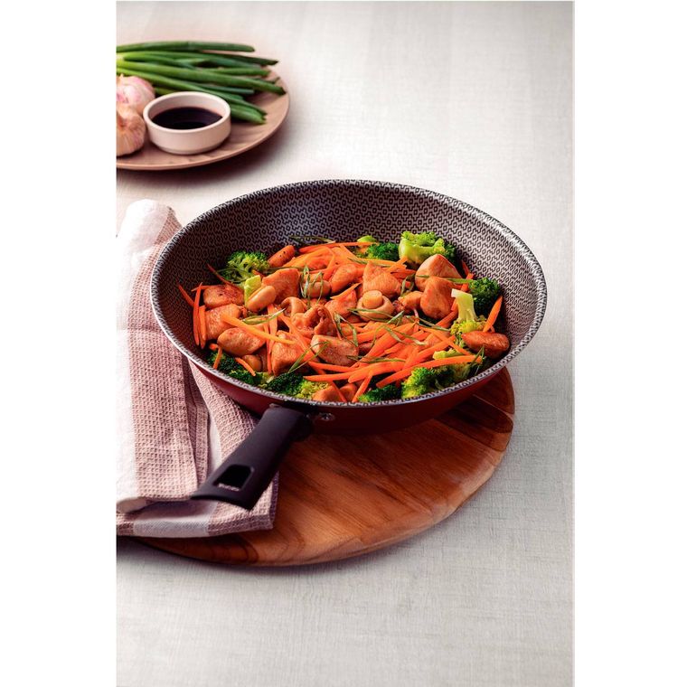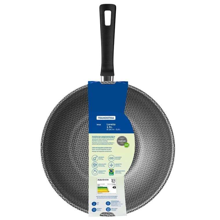 A Wok Tramontina Loreto em alumínio com revestimento interno e externo em antiaderente Starflon Max vermelho 28 centímetros de diâmetro 3,6 litros é aquele item que levará muita versatilidade para sua cozinha, seja para preparar um yakisoba ou um refogado de legumes. Ela é produzida em alumínio e conta com revestimento interno e externo em antiaderente Starflon Max, características que juntas proporcionam um cozimento rápido e uniforme dos alimentos, evita que eles grudem em sua superfície e a torna superfácil de limpar. Seu cabo é em baquelite, material que não aquece e oferece maior segurança e conforto ao manuseio. A wok ainda pode ser levada à máquina de lavar louças e vai deixar seu dia a dia na cozinha muito melhor!