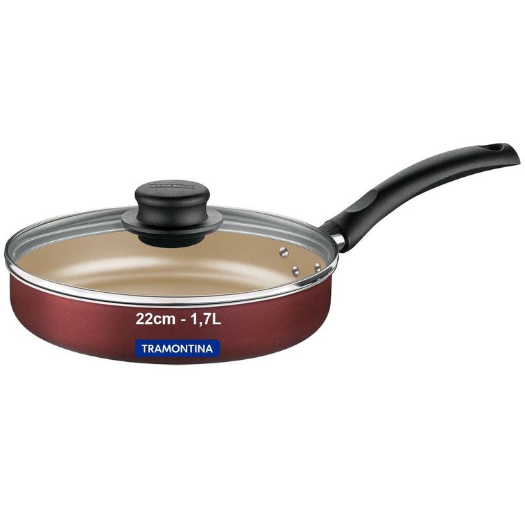 - 1 Frigideira reta Tramontina Turim com revestimento antiaderente com tampa de vidro 22 cm 1,7 L.