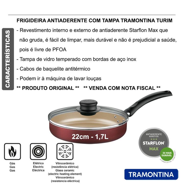 Com a frigideira reta Tramontina Turim em alumínio com revestimento interno e externo em antiaderente Starflon Max vermelho com tampa de vidro 22 centímetros de diâmetro 1,7 litros você irá equipar sua cozinha com um item que vai garantir maior praticidade para o preparo das suas receitas preferidas. Produzida em alumínio com revestimento interno e externo de antiaderente Starflon Max, ela proporciona um cozimento rápido e uniforme dos alimentos, sem que eles grudem em sua superfície, o que garante também maior facilidade na limpeza. Seu cabo é em baquelite antitérmico e garante um manuseio muito mais seguro, pois não aquece. A frigideira ainda vem com uma tampa de vidro temperado com bordas de aço inox e pode ser lavada na máquina de lavar louças que vai facilitar seu dia a dia!
