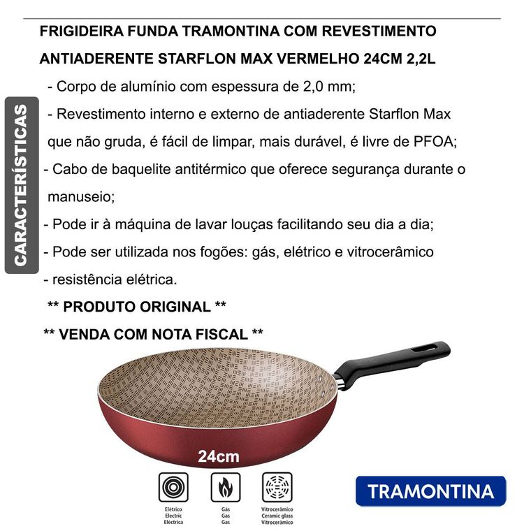 - 1 Frigideira Funda Tramontina em Alumínio com Revestimento Interno e Externo em Antiaderente Starflon Max Vermelho 24 cm 2,2 L.