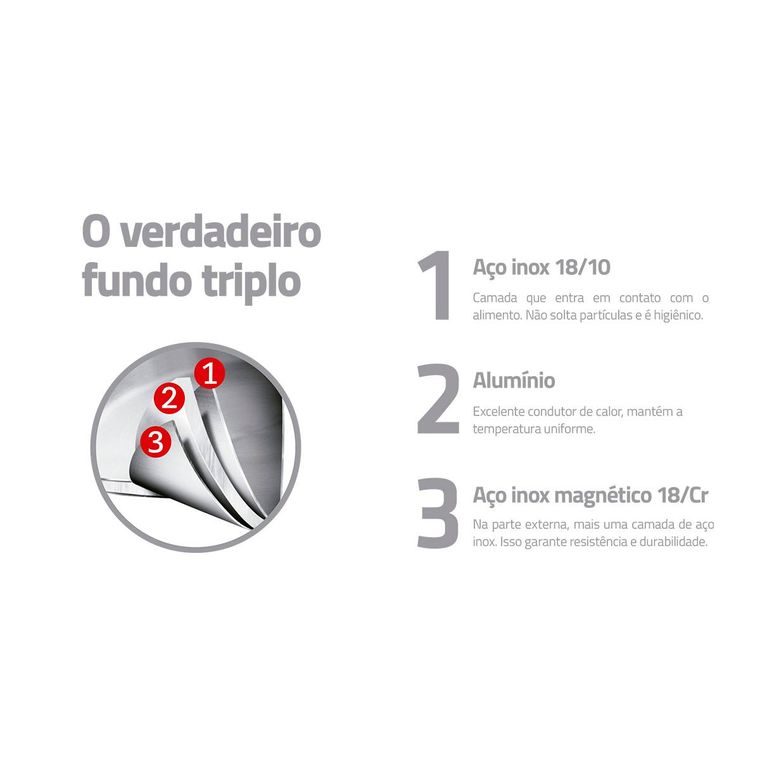- O fundo triplo distribui uniformemente o calor, não sendo necessário o fogo alto. E, além disso, você economiza energia.