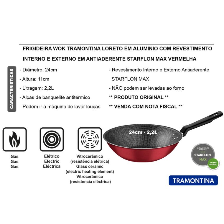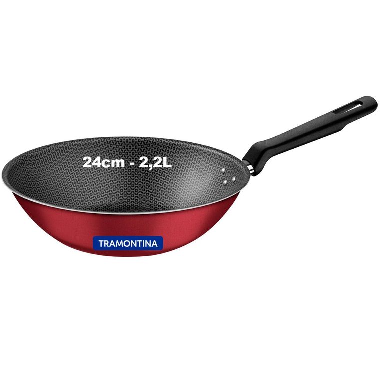 WOK TRAMONTINA LORETO EM ALUMÍNIO COM REVESTIMENTO INTERNO E EXTERNO EM ANTIADERENTE STARFLON MAX VEMELHO 24CM 2,2 L
