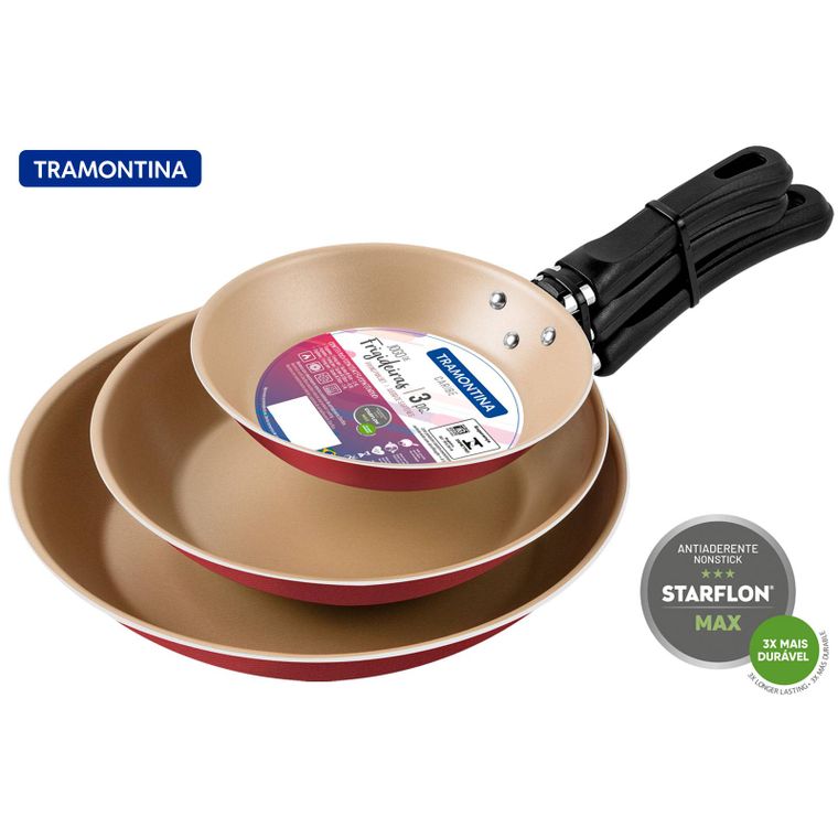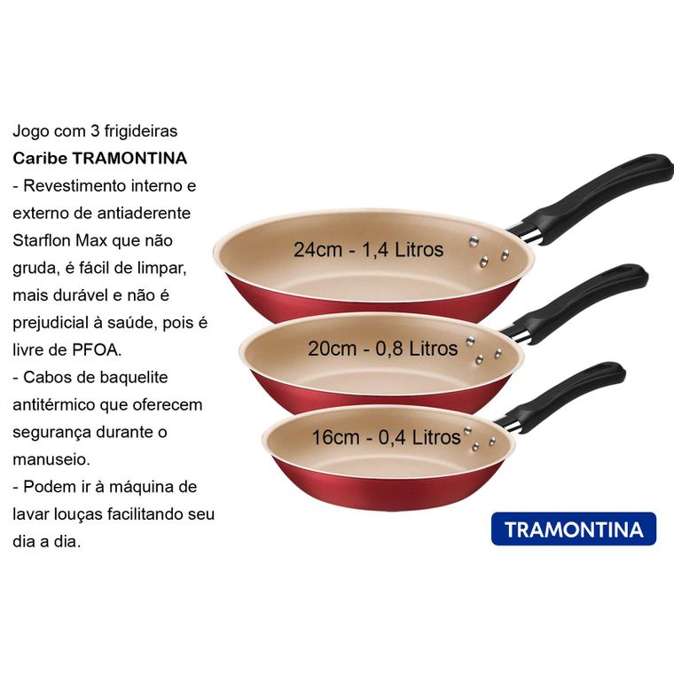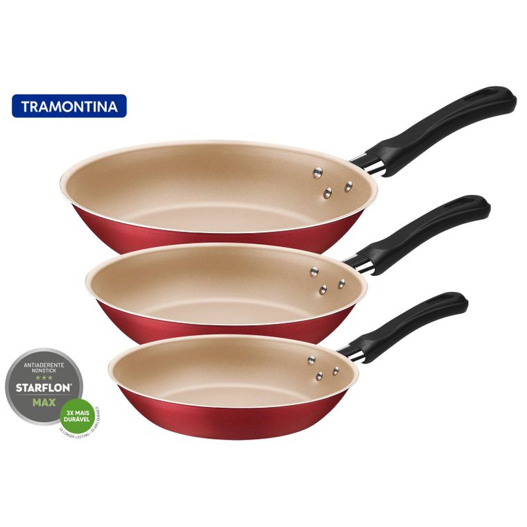 JOGO DE FRIGIDEIRAS TRAMONTINA CARIBE EM ALUMINIO COM REVESTIMENTO INTERNO ANTIADERENTE STARFLON MAX VERMELHO 03 PEÇAS