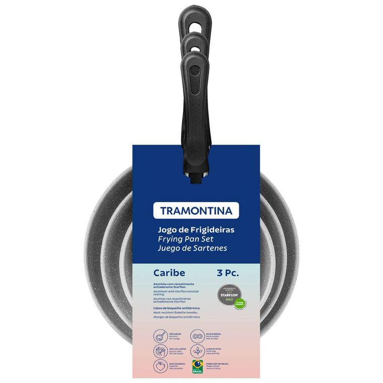 Descubra o prazer de cozinhar e criar receitas incríveis, com o jogo de frigideiras Tramontina Caribe em alumínio com revestimento interno e externo antiaderente Starflon Max preto 03 peças. Produzidas em alumínio com revestimento antiaderente Starflon Max, suas frigideiras cozinham os alimentos de maneira rápida e uniforme, sem que eles grudem em sua superfície. Seus cabos são em baquelite antitérmico e proporcionam um manuseio muito confortável e seguro, pois reduzem a propagação de calor. Além de todos estes atributos incríveis, as frigideiras são muito fáceis de limpar e podem ser lavadas na máquina de lavar louças, otimizando seu dia a dia na cozinha. Sem dúvida, a escolha perfeita para levar alta qualidade e beleza para sua cozinha, garantindo um preparo das suas refeições muito mais prático!