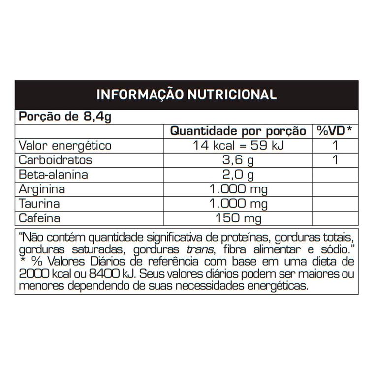 Beta-alanina, isomaltulose, L-arginina, taurina, cafeína, aromatizantes, acidulanteácido cítrico, edulcorante sucralose, antiumectante dióxido de silício e corantes artificiais amaranto e azul brilhante fcf.