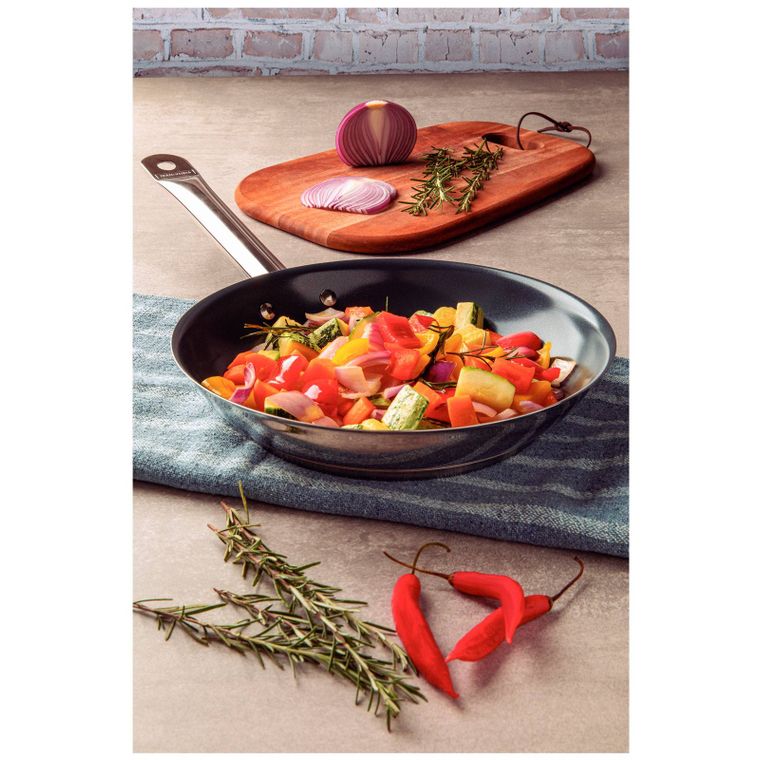 Produto da linha Professional, ela possui revestimento cerâmico que ajuda a manter a umidade dos alimentos, tudo isso com um cozimento rápido além de manter os alimentos por mais tempo aquecidos devido ao seu fundo triplo (aço inox + alumínio + aço inox).