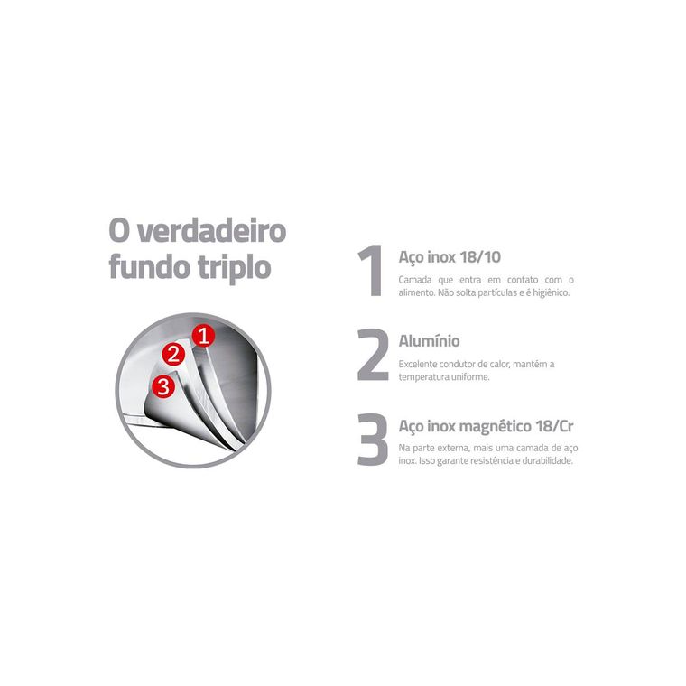 - O fundo triplo (aço inox + alumínio + aço inox) distribui o calor uniformemente, proporcionando um cozimento mais rápido e uniforme, economizando energia e deixando os alimentos aquecidos por mais tempo.