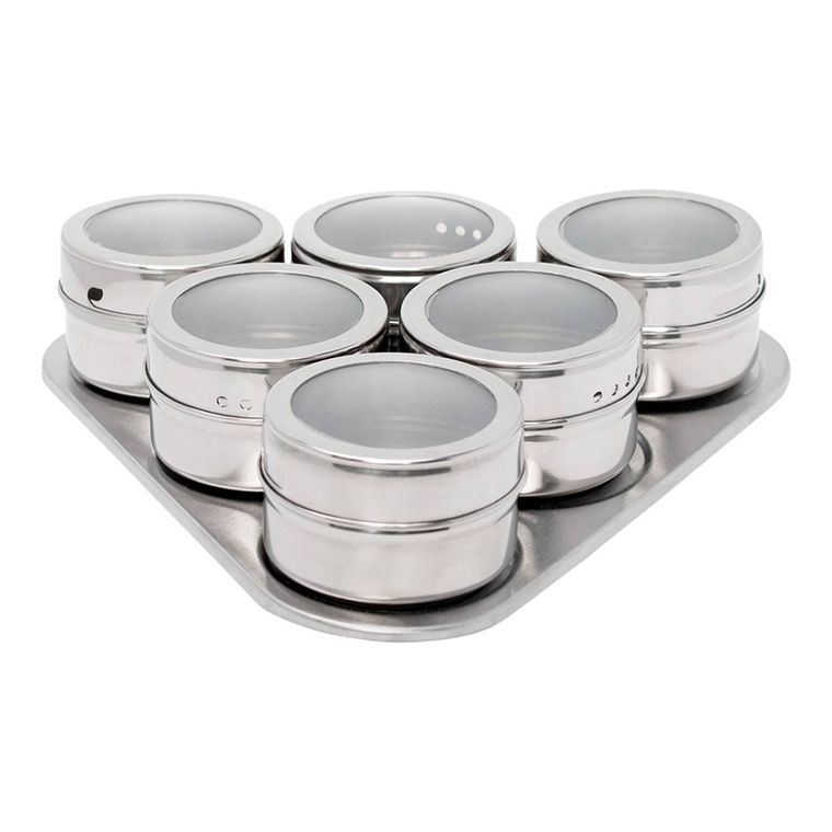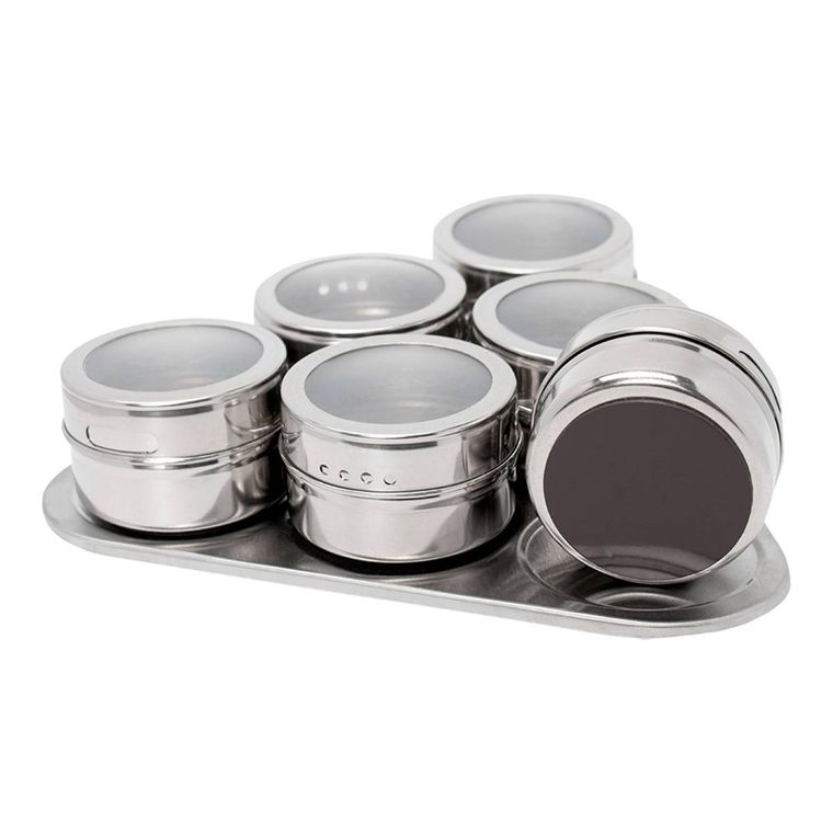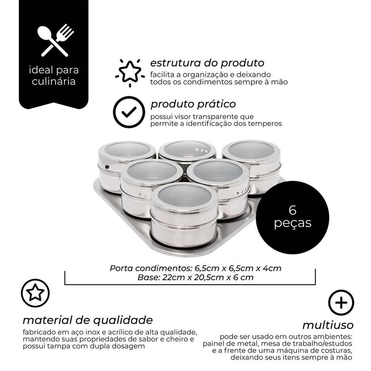 O CONJUNTO: Contém 6 potes e base magnética, facilitando a organização e deixando todos os condimentos sempre à mão. Fabricado em aço inox e acrílico de alta qualidade, mantendo suas propriedades de sabor e cheiro. Possui tampa com dupla dosagem.