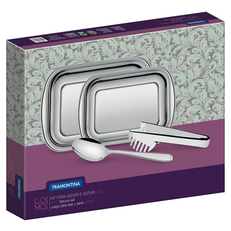 Cozinhar é um jeito de amar, então ame com beleza e praticidade. Com o Kit para Assar e Servir Tramontina Cosmos em Aço Inox 4 Peças você deixa sua vida mais bonita e prática. Ideal para assar e servir, ele é feito com peças totalmente de aço inox, por isso não soltam nenhum resíduo nos alimentos, mantendo-os saudáveis. Altamente duráveis mantêm suas características originais, preservando a beleza, a higiene e a durabilidade do material. A Linha Cosmos Tramontina é o prazer em fazer bonito.