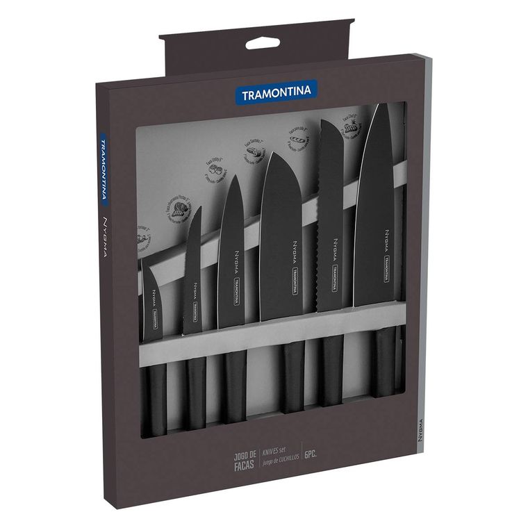 JOGO DE FACAS TRAMONTINA NYGMA COM LÂMINAS EM AÇO INOX E CABOS DE POLIPROPILENO TEXTURIZADOS PRETO 6 PEÇAS