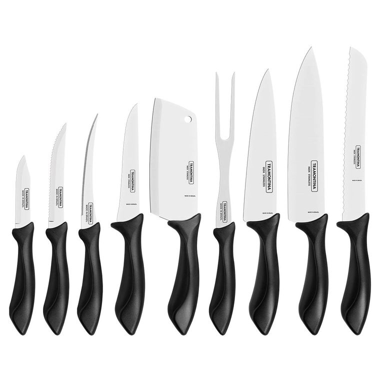 Escolha Tramontina e garanta itens com excelente poder de corte e que vão deixar seu dia a dia na cozinha muito mais prático! Com o jogo de facas Tramontina Affilata com lâmina em aço inox e cabo de polipropileno preto 9 peças, não vão faltar motivos para você arrasar na cozinha. Ideal para uso diário, ele tem peças produzidas com cabos em polipropileno e lâminas de aço inox com tratamento térmico, o que proporciona o corte perfeito em carnes, legumes e vegetais.
