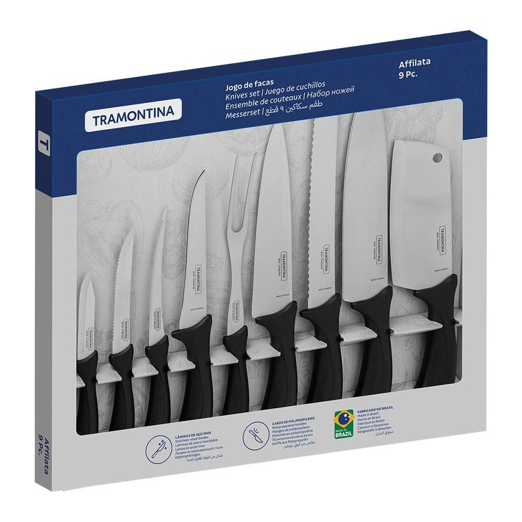 JOGO DE FACAS TRAMONTINA AFFILATA COM LÂMINA EM AÇO INOX E CABO DE POLIPROPILENO PRETO 9 PEÇAS