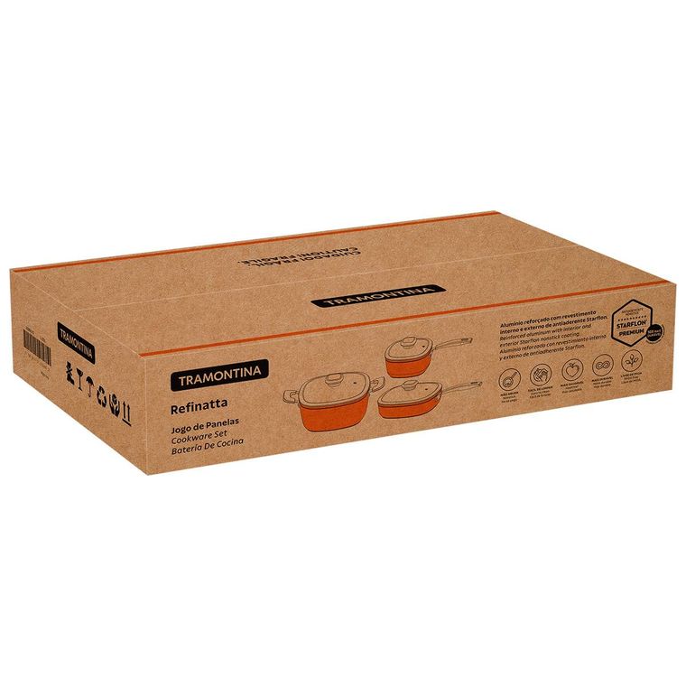 Composto por panela, caçarola e frigideira, ele é um jogo ideal para quem preza por alta qualidade na cozinha, sem abrir mão da beleza e da funcionalidade. As peças são produzidas com corpo de alumínio com espessura de 3,0 milímetros e revestimento em antiaderente Starflon Premium, proporcionam um cozimento rápido e uniforme dos alimentos, sem que eles grudem em superfície. Elas vem com tampas de vidro temperado com saída de vapor e bordas de silicone, tem alças e cabos de aço inox com proteção de silicone e pegadores de baquelite antitérmico, que reduzem a propagação de calor, aumentam a segurança e melhoram a empunhadura. As peças do jogo ainda podem ir à máquina de lavar louças, são fáceis de limpar, mais duráveis e não são prejudiciais à saúde.
