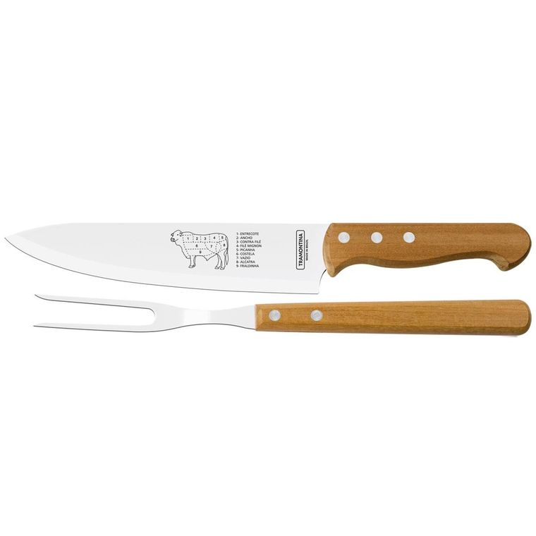 JOGO TRINCHANTE TRAMONTINA PARA CHURRASCO COM LÂMINAS EM AÇO INOX E CABOS DE MADEIRA NATURAL 2 PEÇAS