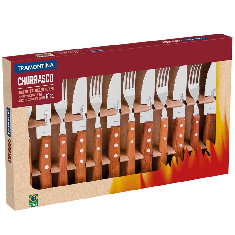 JOGO PARA CHURRASCO TRAMONTINA DYNAMIC COM LÂMINAS EM AÇO INOX E CABOS DE MADEIRA NATURAL 12 PEÇAS