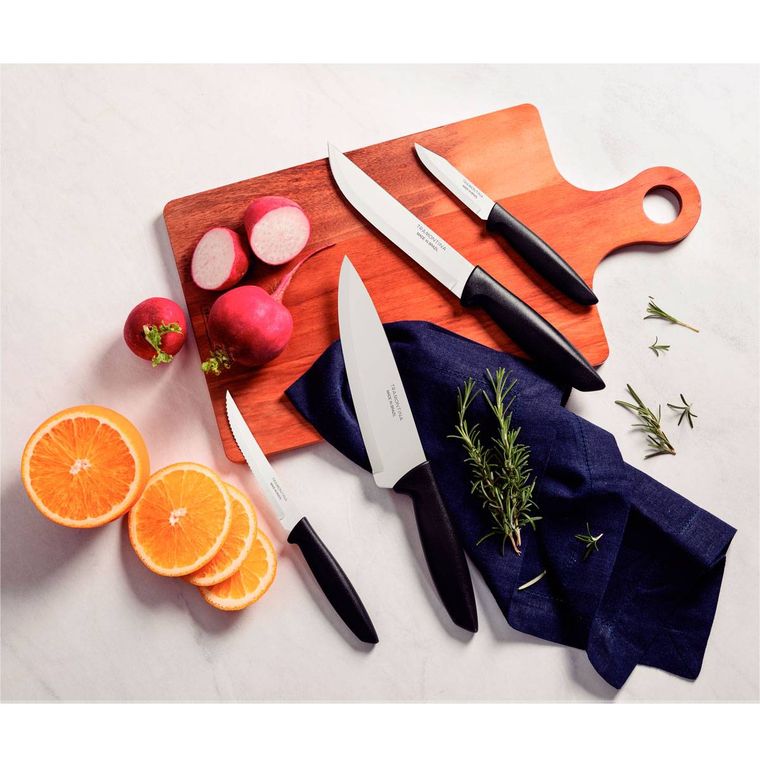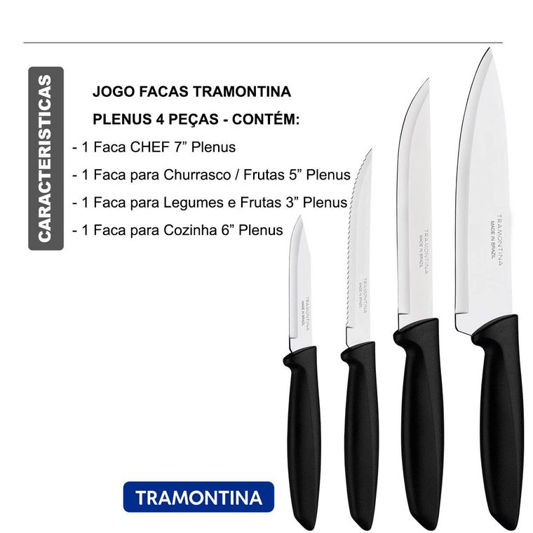 Escolha Tramontina e deixe seu dia a dia na cozinha muito mais prático! Perfeito para uso diário, o jogo de Facas Tramontina Plenus com lâminas em aço inox e cabos de polipropileno preto 04 peças será seu ajudante perfeito na hora de preparar suas refeições, sejam elas com carnes, legumes ou frutas. Composto por facas desenvolvidas com lâminas em aço inox com tratamento térmico e devido a isso, garantem um excelente fio de corte. Os cabos são em polipropileno na cor preta, são resistentes e duráveis, podendo ainda, ir à máquina de lavar louças.