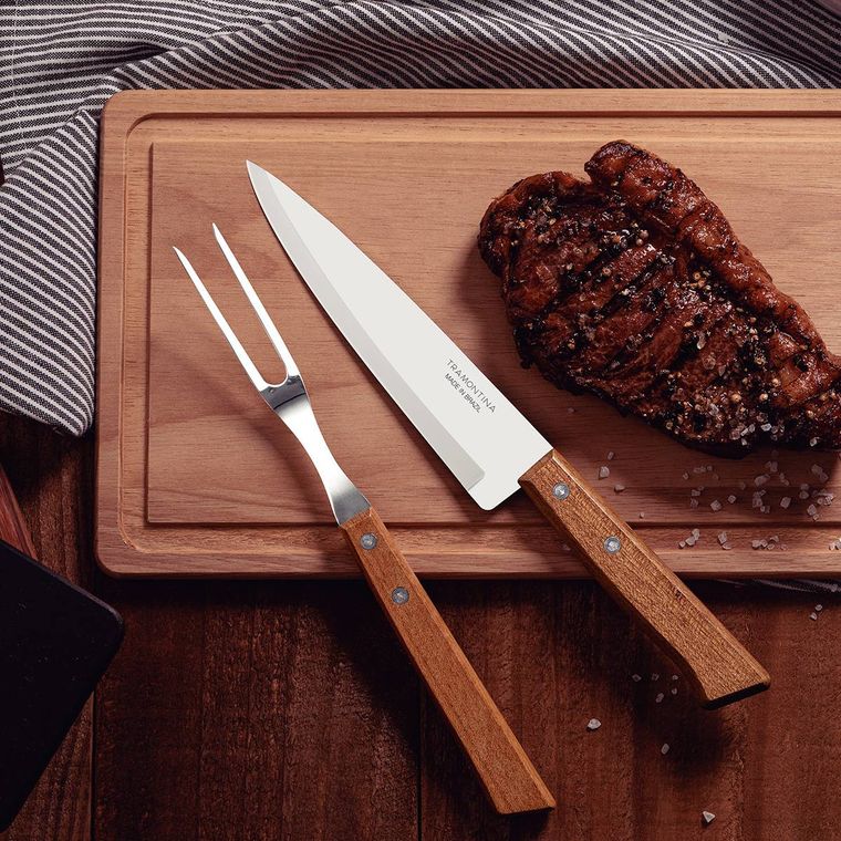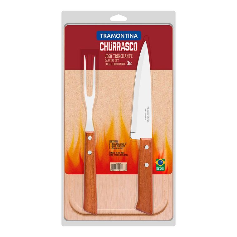 Conte com a Tramontina e deixe sua vida ainda mais gostosa! Com o jogo trinchante Tramontina Churrasco com lâminas em aço inox e cabos de madeira natural você não terá mais trabalho na hora de servir aquele delicioso churrasco para seus amigos e familiares. O jogo conta com uma tábua em madeira, e as peças do jogo são produzidos com lâmina em aço inox, onde a faca possui maior durabilidade em seu fio de corte, devido ao tratamento térmico e o garfo garante maior resistência ao uso. Os cabos são em madeira natural com rebites de alumínio e proporcionam um manuseio muito mais seguro e confortável, pois o formato se adequa perfeitamente à palma da mão.