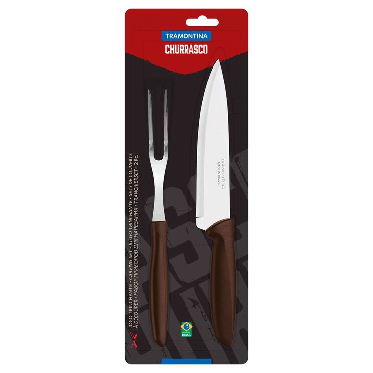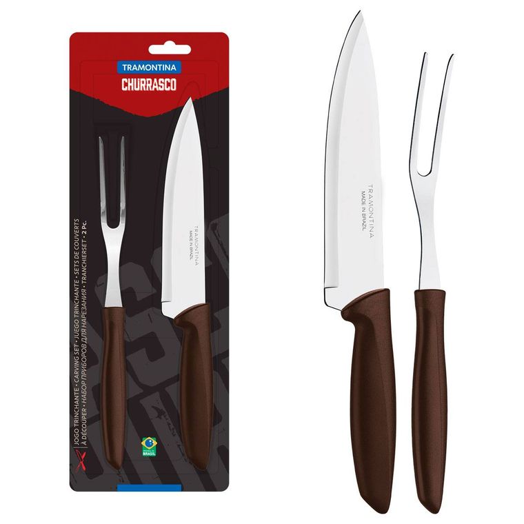 JOGO TRINCHANTE TRAMONTINA PLENUS COM LÂMINAS EM AÇO INOX E CABOS DE POLIPROPILENO MARROM 2 PÇS