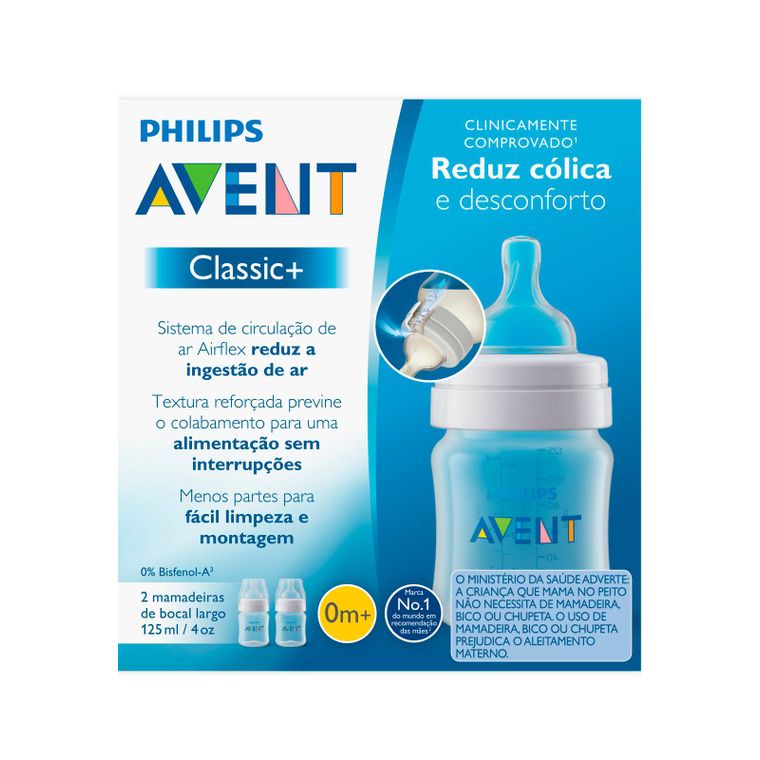 KIT 2 MAMADEIRAS AVENT CLÁSSICA ANTI-CÓLICA 125ml - 0% BPA - TRANSP. - PHILIPS AVENT