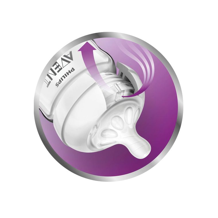 - Sistema anticólica: válvula dupla inovadora que reduz a cólica e o desconforto, ventilando ar para dentro da mamadeira, e não para a barriga do bebê.
