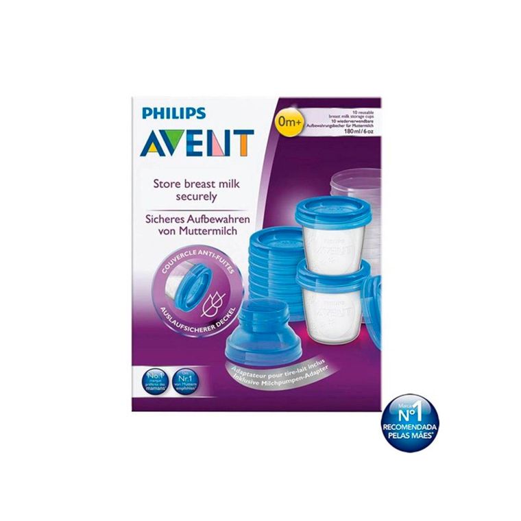 Armazene o leite materno de forma mais segura e higiênica com esses Copos para Armazenar Leite da Avent. Os copos possuem tampa giratória a prova de vazamentos, podem ser empilhados, seu material permite que as mamães escrevam a data com caneta e o adaptador permite com que a mãe faça a extração e armazene o leite no mesmo compartimento. Eles podem ser guardados no congelador, na geladeira e pode ser utilizado no aquecedor de mamadeiras. Compatível com a linha Pétala e Clássica. A embalagem possui 10 copos reutilizáveis e cada um comporta até 180ml. Também são ótimos para armazenar as papinhas do bebê.
