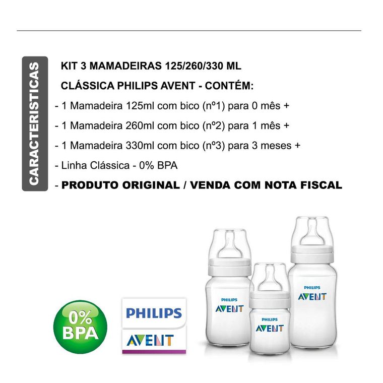 COMPATIBILIDADE COM LINHA - A mamadeira Philips (Clássica) é compatível com grande parte da linha Philips AVENT. Recomendamos o uso da mamadeira (Clássica) somente com os bicos (Clássica)