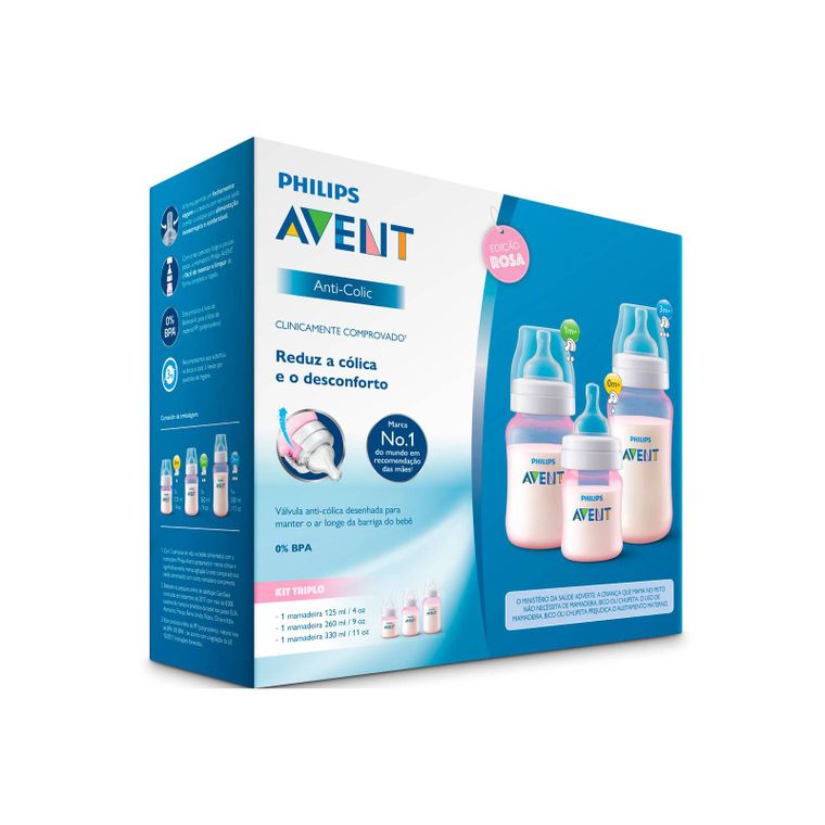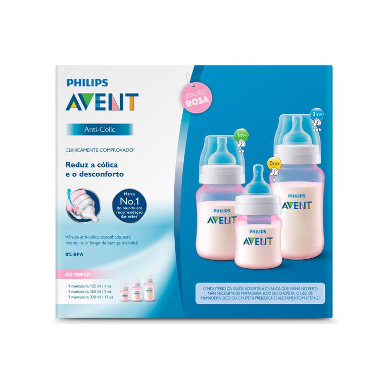 KIT 3 MAMADEIRAS AVENT CLÁSSICA ANTI-CÓLICA 125ml 260ml e 330ml - 0% BPA - ROSA - PHILIPS AVENT - SCD809/42