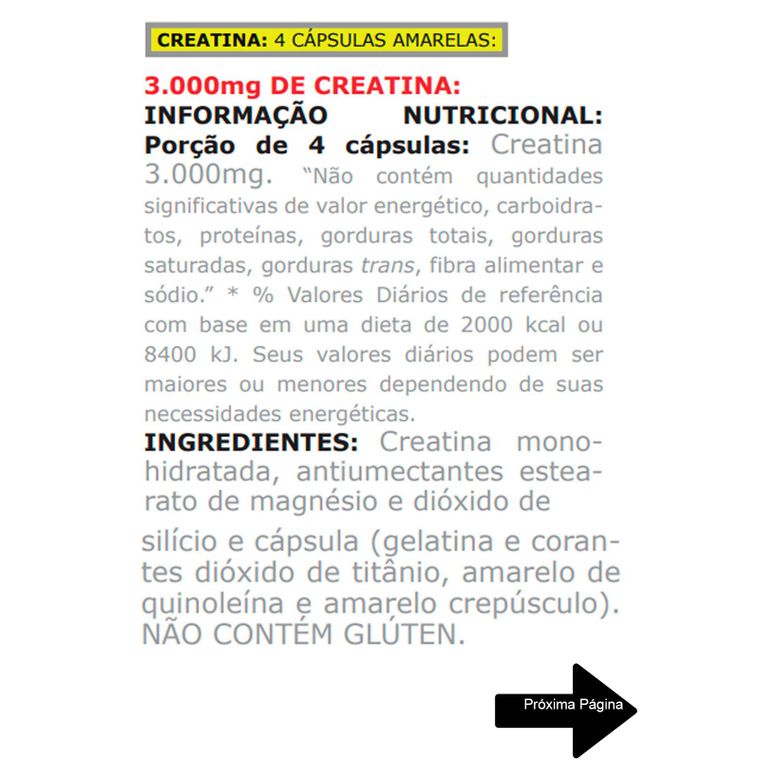 - CREATINA: Creatina monohidratada, cápsula (gelatina, água purificada, corantes amarelo de quinoleína, amarelo crepúsculo e dióxido de titânio). NÃO CONTÉM GLÚTEN.