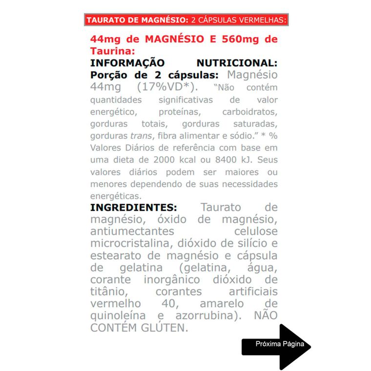 - TAURATO DE MAGNÉSIO: Taurato de magnésio, óxido de magnésio, antiumectantes celulose microcristalina, dióxido de silício e estearato de magnésio e cápsula de gelatina (gelatina, água, corante inorgânico dióxido de titânio, corantes artificiais vermelho 40, amarelo de quinoleína e azorrubina). NÃO CONTÉM GLÚTEN.