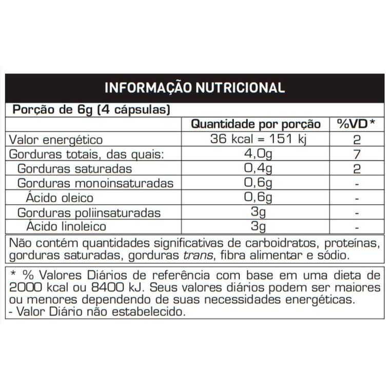 Óleo de Cártamo (Carthamus tinctorius). Cápsula: gelatina (geleificante) e glicerina (umectante).