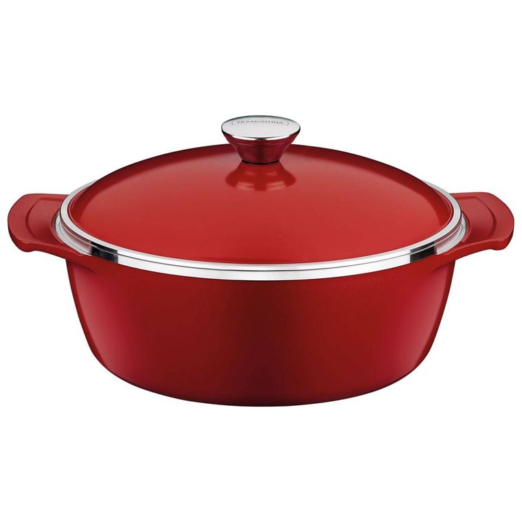 - 1 Caçarola Tramontina Lyon em Alumínio Forjado com Revestimento Interno Antiaderente Starflon e Externo de Silicone Vermelho com Tampa 30 cm 6,8 L.