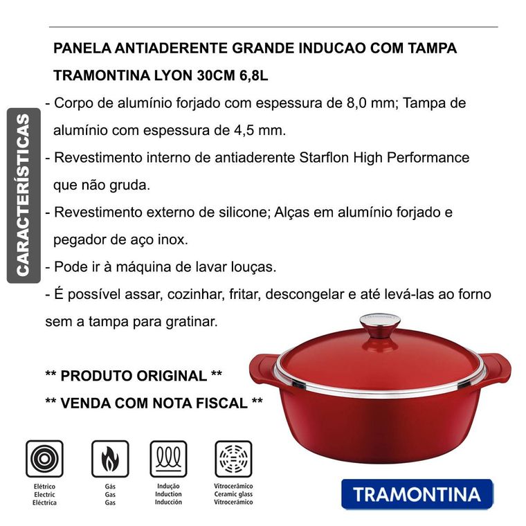 PANELA ANTIADERENTE GRANDE INDUCAO COM TAMPA TRAMONTINA LYON 30CM 6,8L